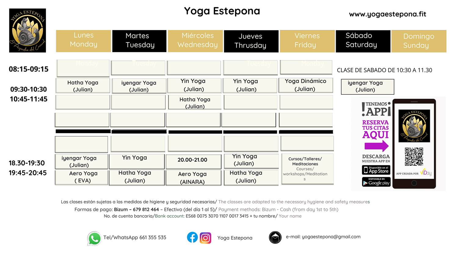 Las clases están sujetas a las medidas de higiene y seguridad necesarias / The classes are adapted to the necessary hygiene and safety measures.